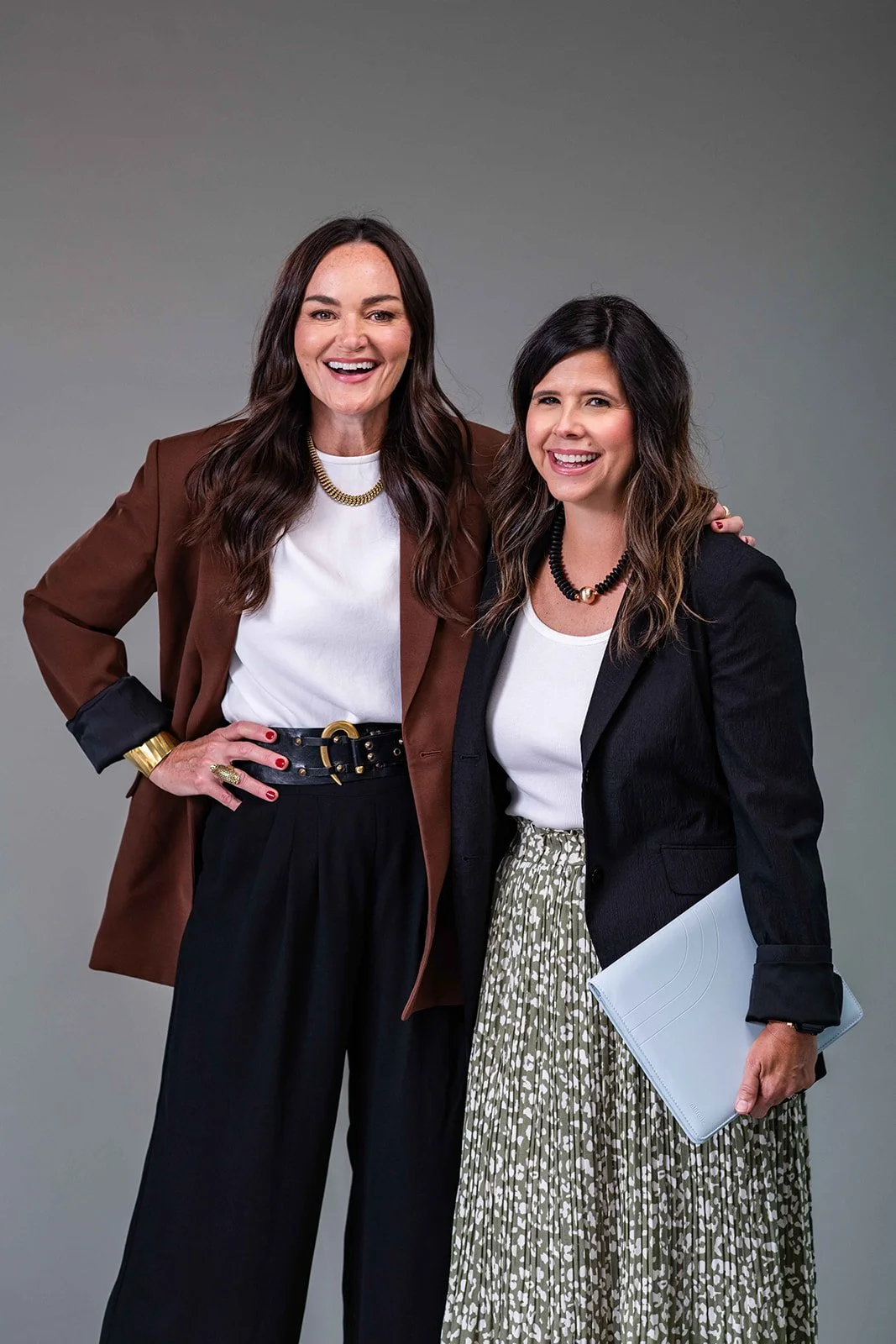 Two women standing together, smiling. One has long dark hair, wearing a brown blazer, white shirt, and black pants, with gold jewelry. The other has shoulder-length dark hair, wearing a black blazer, white shirt, and patterned skirt, holding a light blue folder.