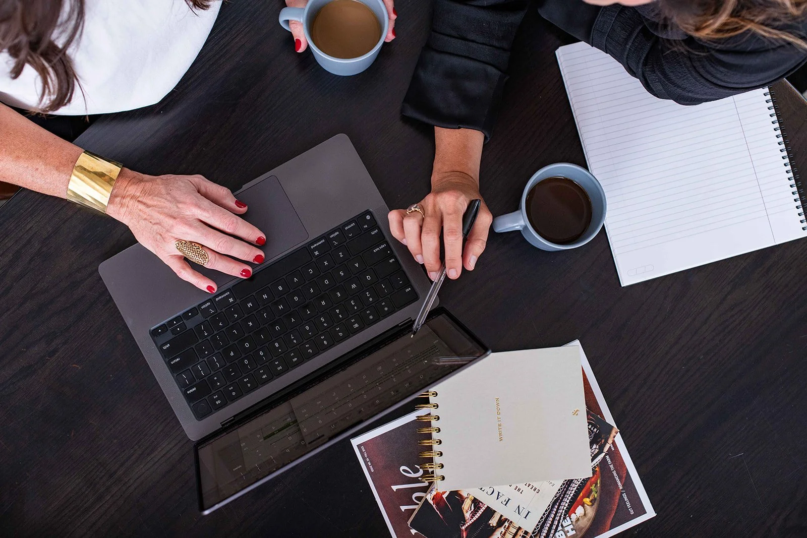 Two women working at a dark wooden table with notebooks, a laptop, and coffee mugs.